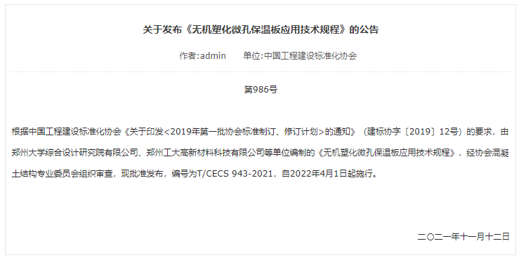 由鄭州大學綜合設計研究院有限公司、我司主編,中國建筑科學研究院有限公司等十七家單位參編的《無機塑化微孔保溫板應用技術規程》(以下簡稱:《規程》)近日發布,自2022年4月1日起施行。