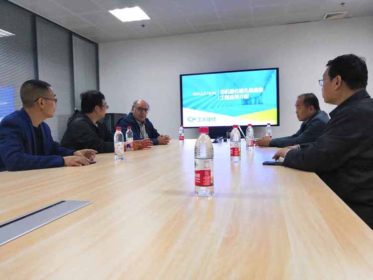 約旦ACC公司采用美國陶氏公司技術生產有機類保溫材料,產品廣泛應用于中東建筑市場,但因達不到A級燃燒等級,近期在沙特的建筑工地二次引發了火災。 為了盡快找到替代產品與生產技術, ACC公司制造主管HANI ABU KHALAF先生到公司進行了商務與技術交流,公司總經理趙振波先生與技術團隊參加了交流。客商對公司研發的無機塑化微孔保溫板項目表示了極大的合作興趣。
